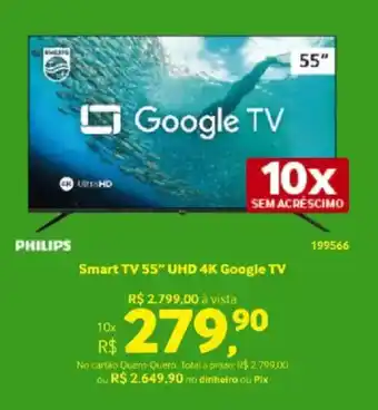 PHILIPS Smart TV 55" UHD 4K Google TV está com promoção ativa na Quero Quero, válida de 07-04-2026 até 30-04-2026. Veja aqui o preço atual e as melhores condições. Compre online pelo site da Quero Quero ou acompanhe para comparar com outras ofertas futuras.