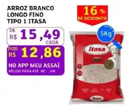 Assaí Atacadista Arroz branco longo fino tipo 1 itasa ofertaArroz branco longo fino tipo 1 itasa 5 kgAssaí AtacadistaR$ 15,49R$ 12,8616% DE DESCONTO24 abril 202627 abril 2026
