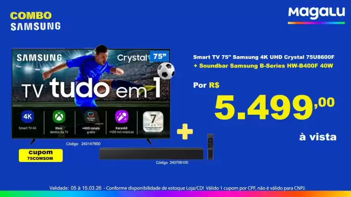 O folheto da próxima semana da Magalu costuma estar disponível alguns dias antes da data de início, geralmente no fim de semana. No site Catalogosofertas.com.br, publicamos o novo catálogo assim que ele aparece online. Assim, você já pode conferir o encarte com destaques como Smartphone Samsung Galaxy A07, Estante Guararapes | Nature/Off e Panela de pressão elétrica, e planejar suas compras com base nas melhores condições da semana seguinte.
